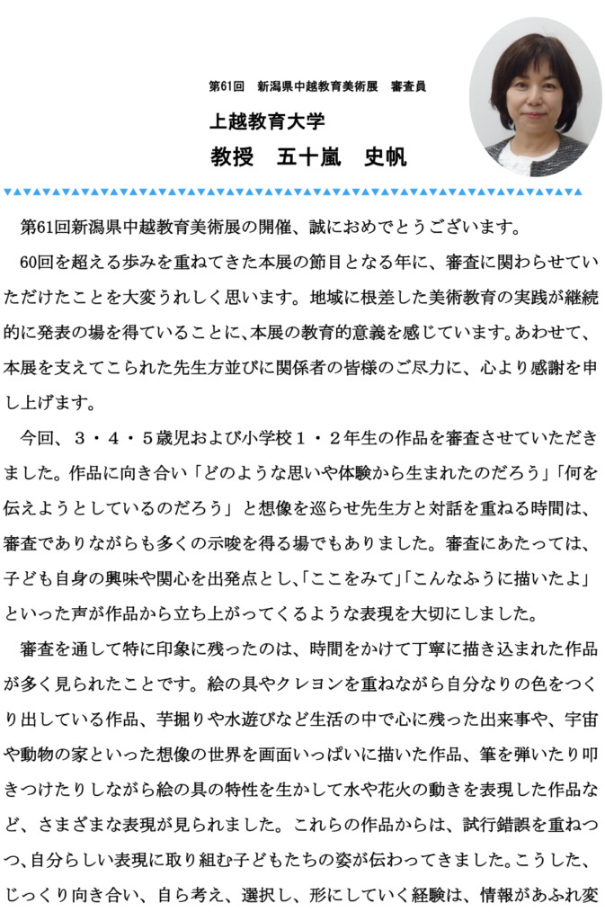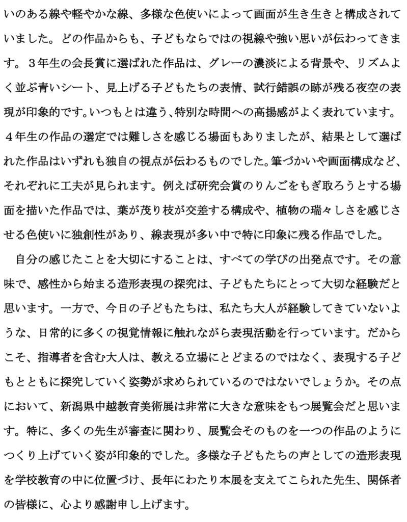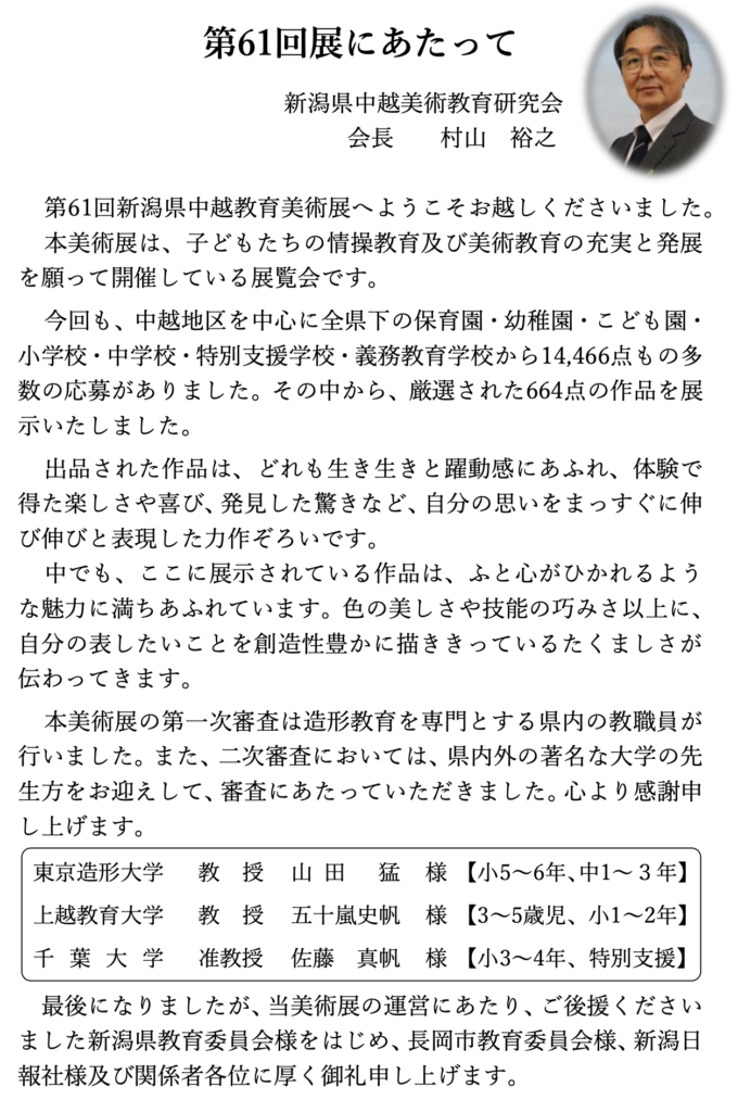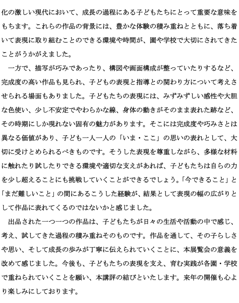 これまで各校園から「子どもたちのエネルギーあふれる作品」を多数出品していただいていることに深く感謝申し上げます。